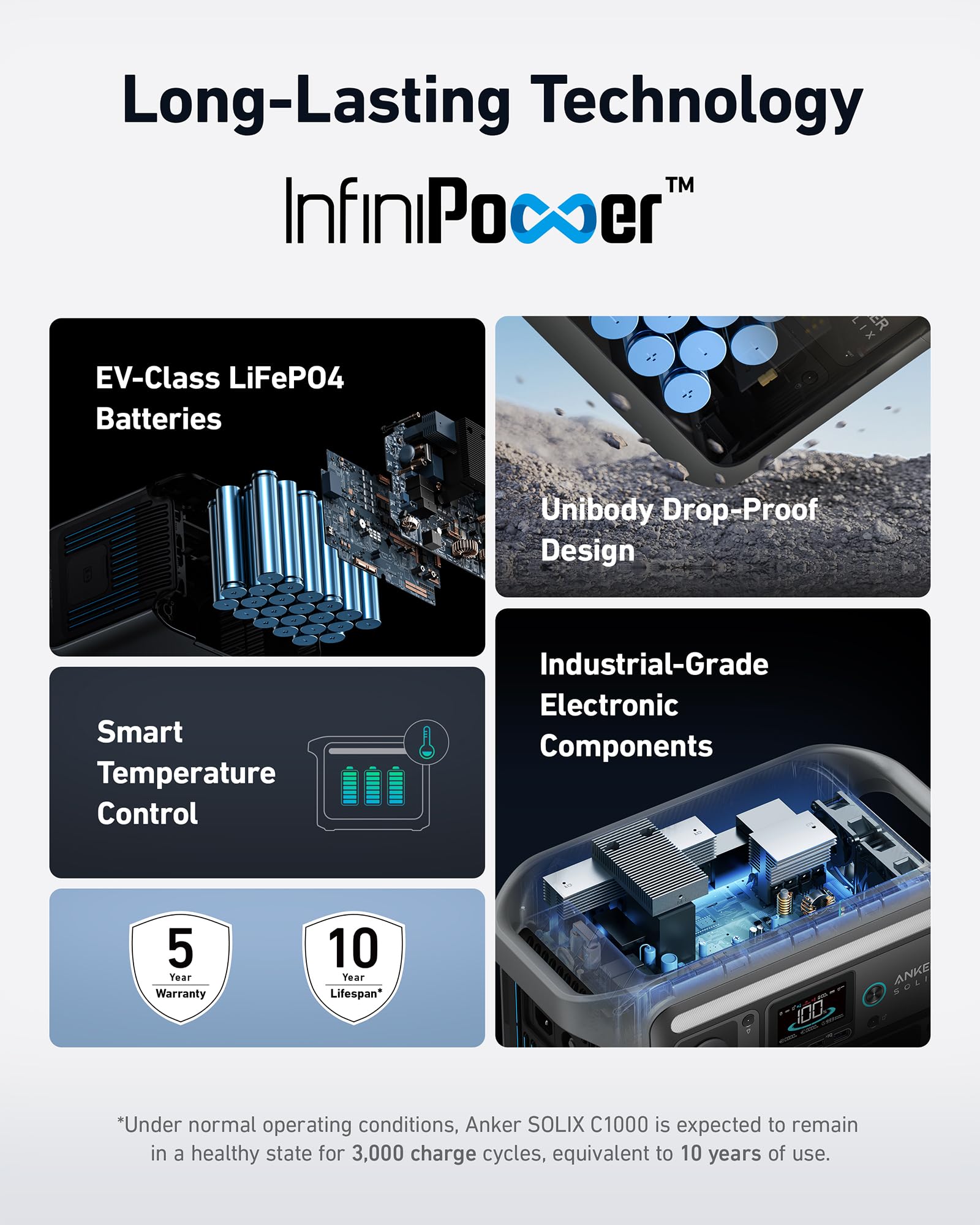 - Decade-Long Durability: LiFePO4 cells rated for 3,000+ cycles over a 10-year lifespan.