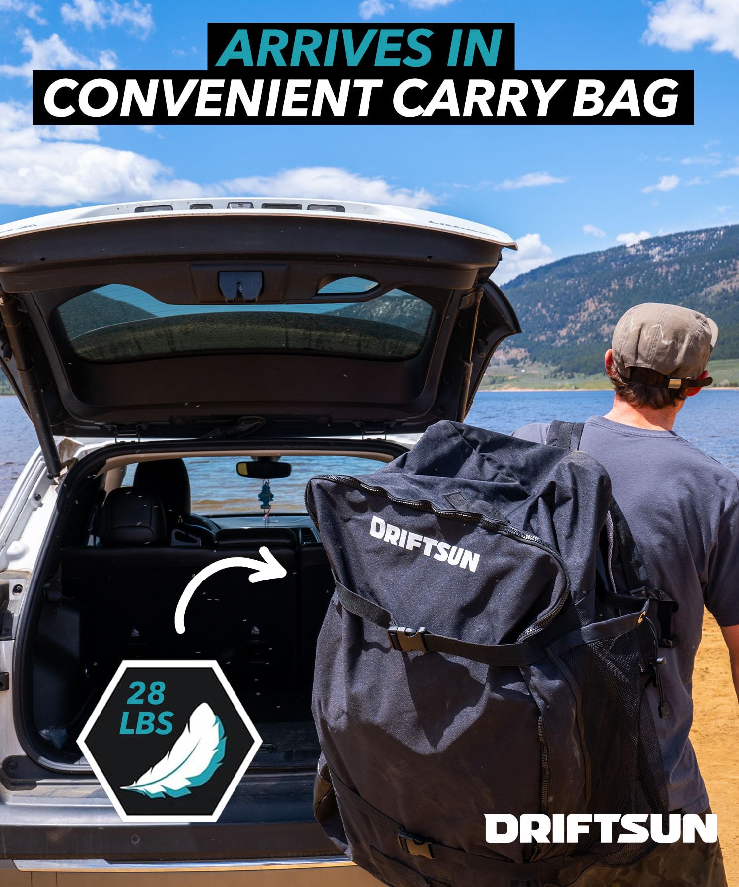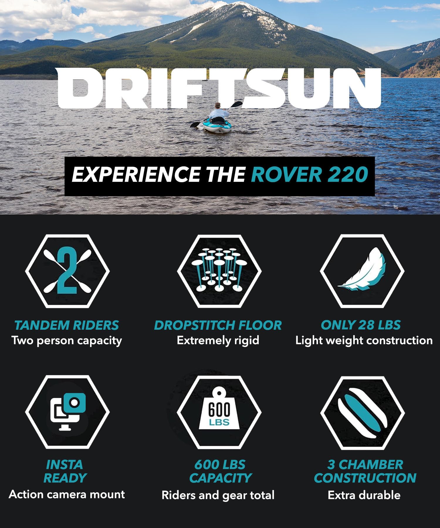 The Driftsun Rover series delivers white water performance in a portable inflatable package. Thanks to its reinforced double-layer PVC and high-pressure drop-stitch floor, you’ll experience the rigidity and responsiveness of a hard shell kayak—even as you pack everything into a carry backpack. The rocker hull profile glides through rapids with confidence, while the removable skeg and self-bailing ports ensure you stay in control whether you’re tackling churning class IV rapids or gliding on glass-flat lakes. With adjustable EVA seats, aluminum paddles, and an integrated action camera mount, the Rover is engineered for comfort, performance, and adventure—so you can push harder, paddle farther, and capture every moment on the water.