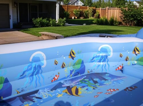This pool is amazing! The canopy is super thoughtful, no worries about sunburn while chilling. The underwater ocean design is so cute, my kids fell in love with it right away and kept asking about all the sea animals. It's really spacious—our family of four fits comfortably, and the seat with backrest is super comfy. The material feels thick and strong, even with the kids going wild. Super happy with it—perfect for an easy, fun summer at home!